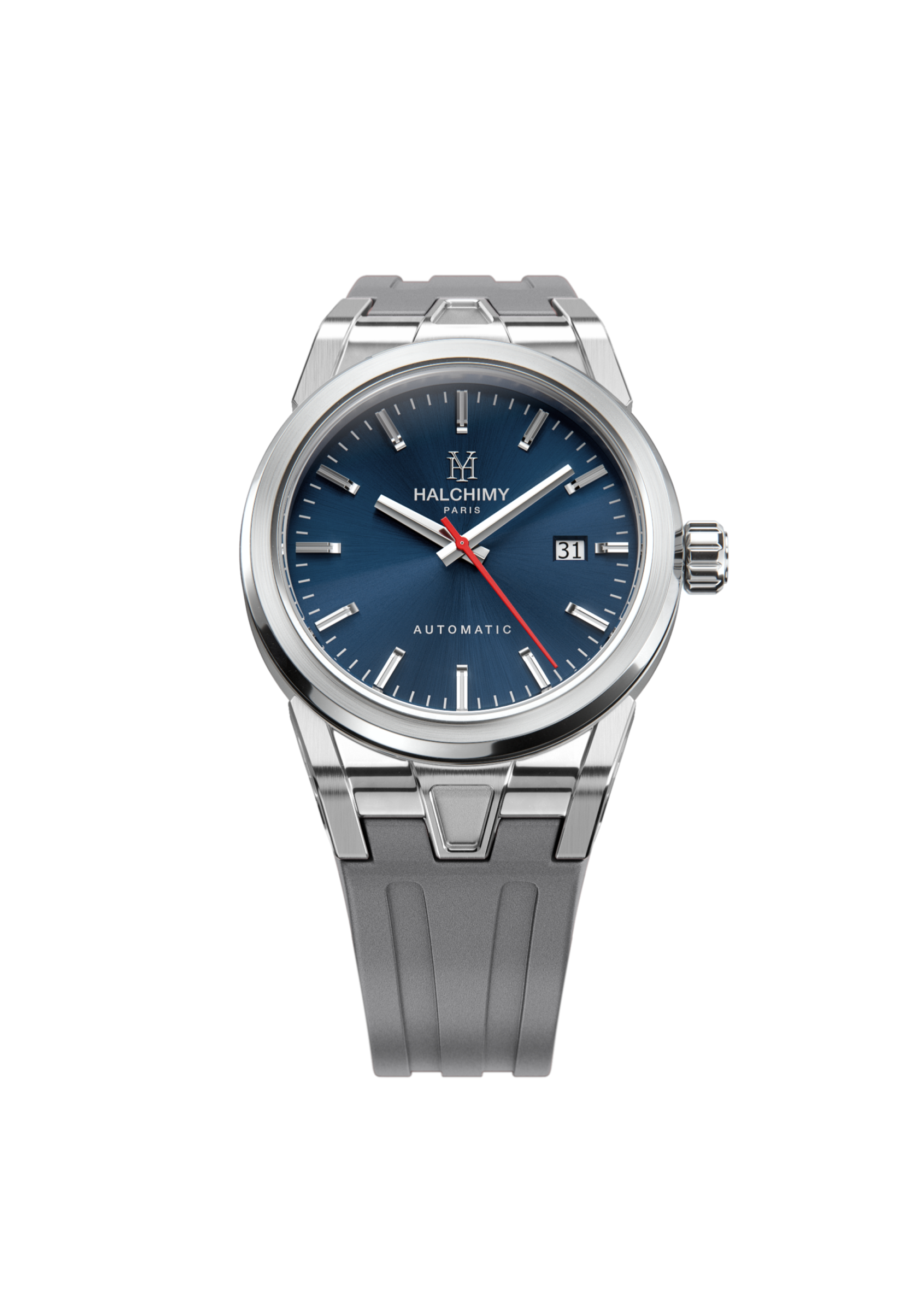 Hours, minutes, seconds, date, Blue dial, Rubber Bracelug